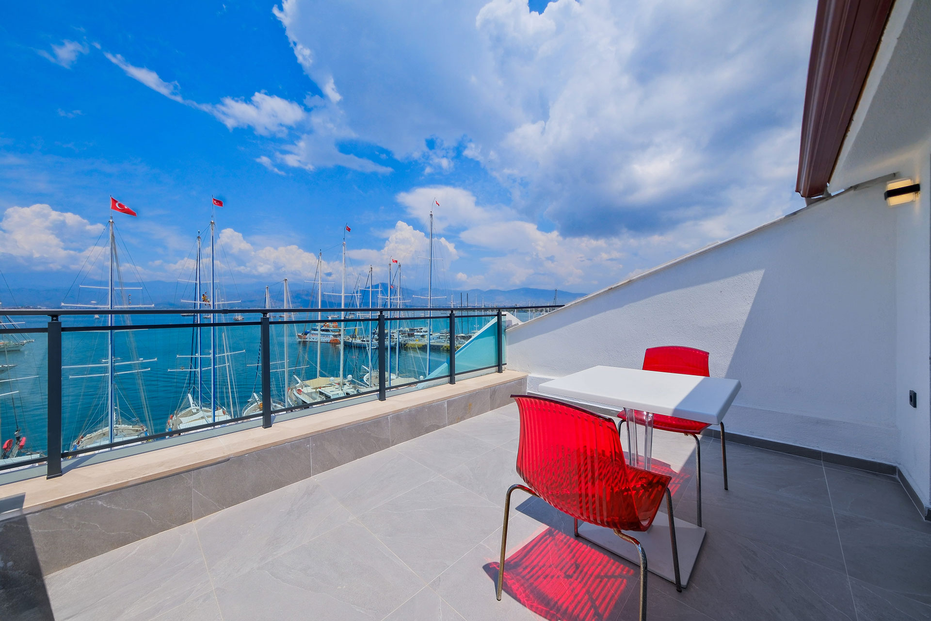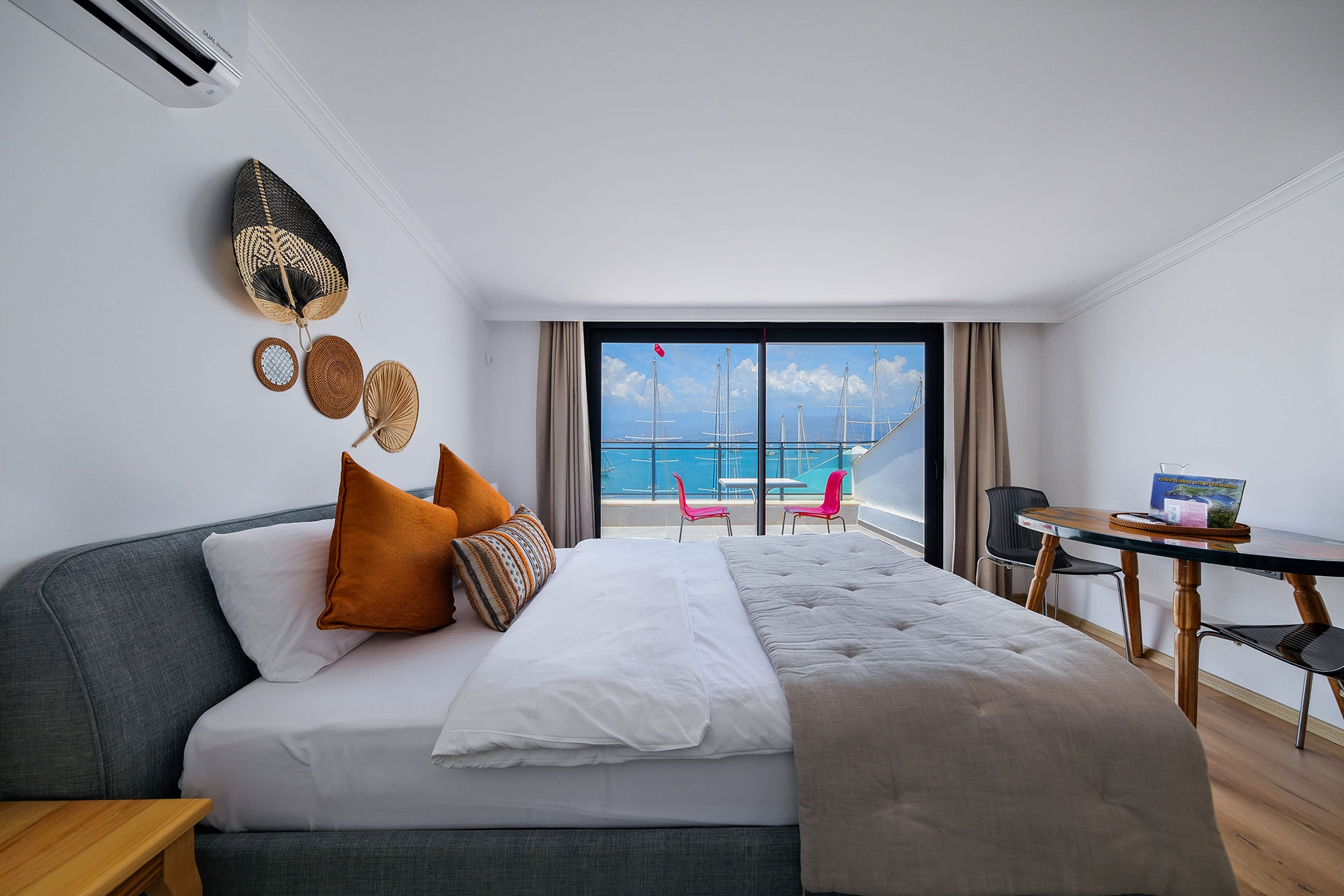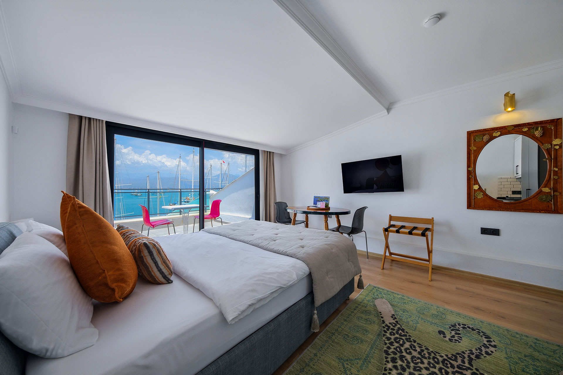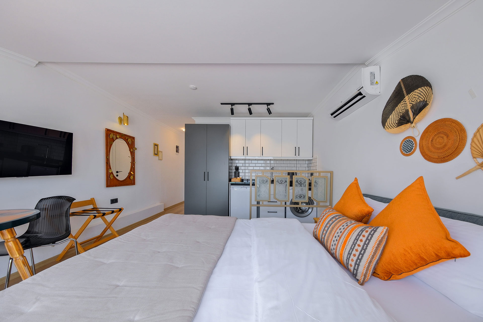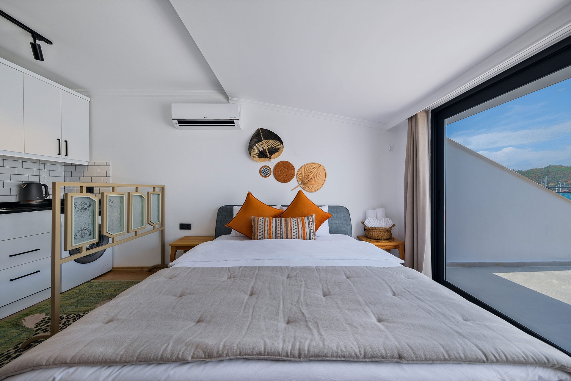 Körfez Apart'ın 5. katında yer alan Lüks Stüdyo dairemiz, misafirlerine Fethiye Körfezi’nin en panoramik ve büyüleyici manzarasını sunar. 22 m2 genişliğindeki bu özel oda, şık ve modern tasarımıyla çiftler için ideal, izole bir kaçış noktasıdır. 1 adet büyük çift kişilik yatağı ile 2 konuk ağırlayabilen stüdyomuz, tam donanımlı mutfağı ve geniş pencereleriyle konforu zirveye taşır. Rodos feribot iskelesinin tam karşısında yer almanın pratikliğini, şehrin en üst katından denizi izlemenin huzuruyla birleştirin.